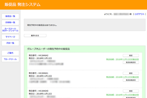 管理ページで各発注履歴の表示・CSVファイルでのダウンロード機能あり。